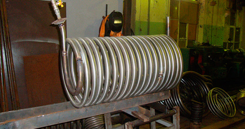 Змеевик для резервуара — это металлическая круглая бесшовная труба. Ее размещают внутри емкости и фиксируют хомутами, предусматривая обязательный тепловой зазор, чтобы при расширении нагретых материалов не возникало лишних напряжений. Впускной и выпускной патрубки нагревательного элемента выводятся снизу корпуса цистерны, выступая на 10–25 см. Соединение с трубами, подающими теплоноситель, резьбовое. В зависимости от конструкции резервуара выбирают прочие параметры: